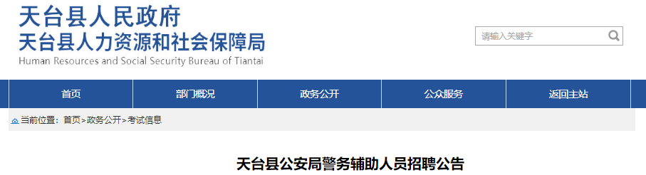 因工作需要,天臺縣公安局面向社會公開招錄警務(wù)輔助人員(下稱輔警)30名,現(xiàn)將有關(guān)事項公告如下: