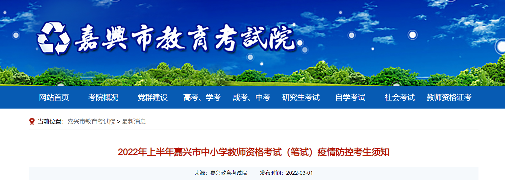 從嘉興市教育考試院獲悉,2022年上半年浙江嘉興市中小學教師資格考試(筆試)疫情防控考生須知已公布,請相關人員仔細閱讀,具體詳情如下: