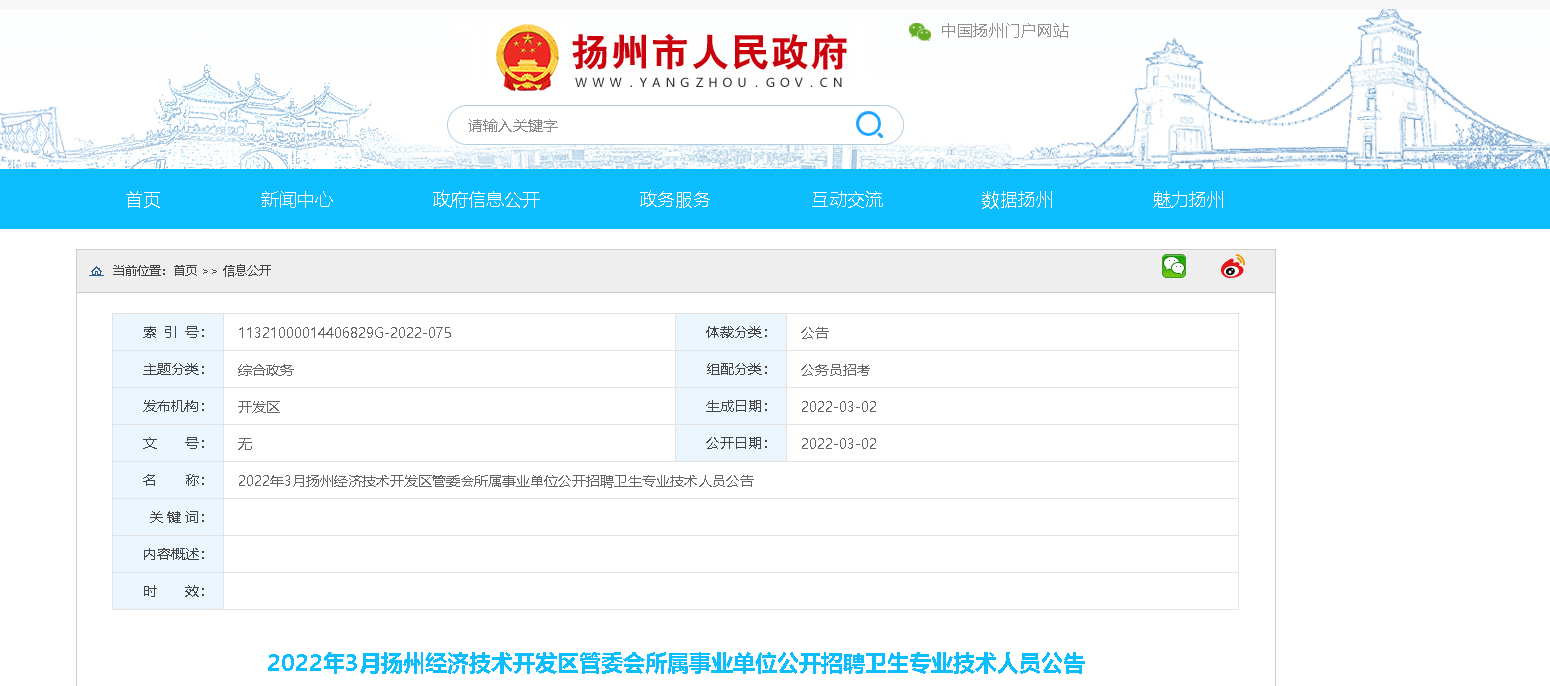 可直接登錄揚(yáng)州經(jīng)濟(jì)技術(shù)開發(fā)區(qū)管委會(huì)網(wǎng)站(http://kfq.yangzhou.gov.cn/),查詢《2022年3月?lián)P州經(jīng)濟(jì)技術(shù)開發(fā)區(qū)管委會(huì)所屬事業(yè)單位公開招聘衛(wèi)生專業(yè)技術(shù)人員崗位條件簡(jiǎn)介表》,也可登錄揚(yáng)州市人力資源和社會(huì)保障局網(wǎng)站(hrss.yangzhou.gov.cn)查詢。