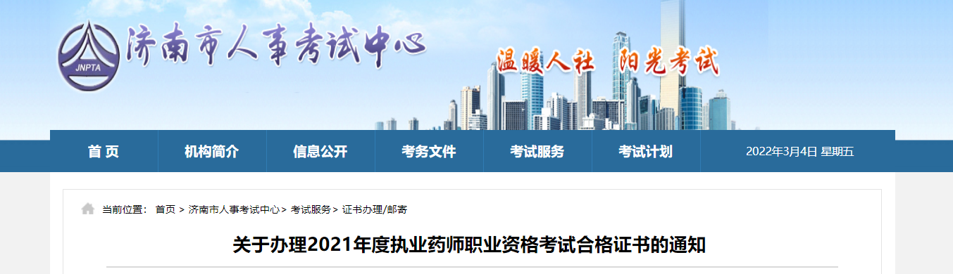 濟南市2021年度執(zhí)業(yè)藥師職業(yè)資格考試合格證書已下發(fā)至我市,現(xiàn)將有關(guān)事項通知如下: