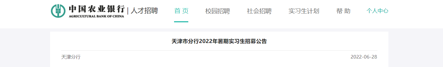 2022年農(nóng)業(yè)銀行天津市分行暑期實(shí)習(xí)生招募若干人,報(bào)名截止時(shí)間:2022年7月5日(周二)24:00,現(xiàn)將招聘公告發(fā)布如下: