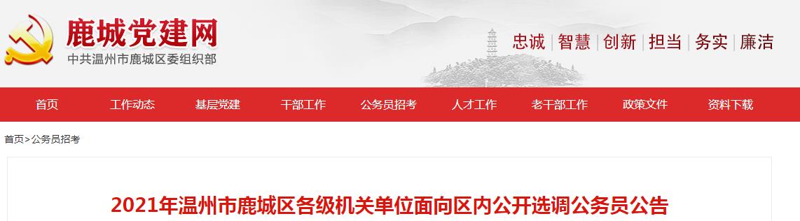 2021年浙江溫州市鹿城區(qū)各級機關(guān)單位面向區(qū)內(nèi)選調(diào)公務(wù)員公告已公布,為了方便廣大考生的查閱,下面為您詳細介紹一下本次選調(diào)公務(wù)員工作的具體事宜,希望廣大考生及時關(guān)注,如有相關(guān)疑問,請關(guān)注公務(wù)員考試頻道為您實時做出的更新。