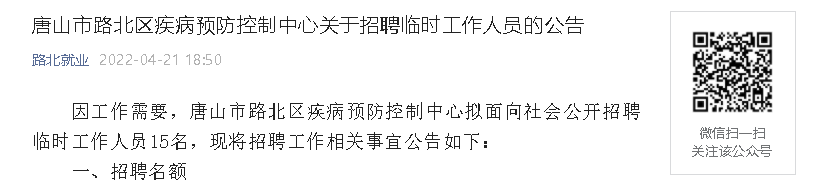 2022河北唐山路北區(qū)疾病預(yù)防控制中心招聘臨時(shí)工作人員15人,報(bào)名時(shí)間:2022年4月21日至4月30日,現(xiàn)將招聘公告原文發(fā)布如下: