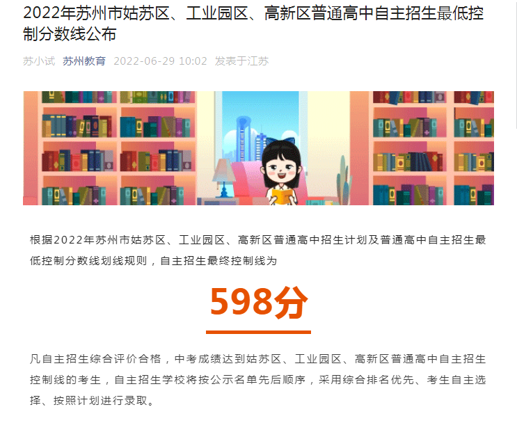 根據(jù)2022年蘇州市姑蘇區(qū)、工業(yè)園區(qū)、高新區(qū)普通高中招生計(jì)劃及普通高中自主招生低控制分?jǐn)?shù)線劃線規(guī)則,自主招生終控制線為598分