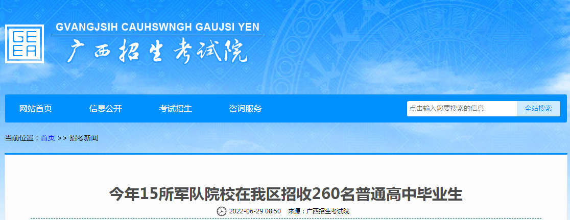 從廣西招生考試院了解到,2022年15所軍隊院校在廣西招收260名普通高中畢業(yè)生,詳細內(nèi)容如下: