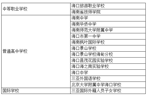 北京師范大學海口附屬學校、上海世外附屬??趯W校、海南中學三亞學校、西南大學三亞中學、中國人民大學附屬中學三亞學校、三亞市崖城中學、中央民族大學附屬中學三亞學校、南開大學附屬中學儋州市第一中學、清華附中文昌學校、北京師范大學萬寧附屬中學、西南大學東方實驗中學、華東師范大學澄邁實驗中學、中央民族大學附屬中學陵水分校、華東師范大學第二附屬中學樂東黃流中學、西南大學臨高實驗中學、華中師范大學第一附屬中學屯昌思源實驗中學、華中師范大學瓊中附屬中學、首都師范大學附屬白沙中學的實驗班、首都師范大學附屬昌江礦區(qū)中學。