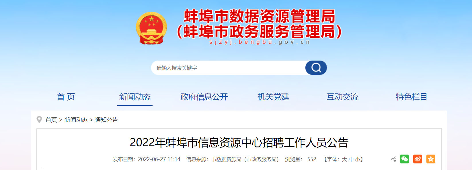 2022安徽省蚌埠市信息資源中心招聘公告已發(fā)布。報名采取網(wǎng)上報名的方式進(jìn)行,統(tǒng)一報名時間為2022年7月4日9:30—7月8日16:00,逾期不再補(bǔ)報?,F(xiàn)將招聘公告原文發(fā)布如下: