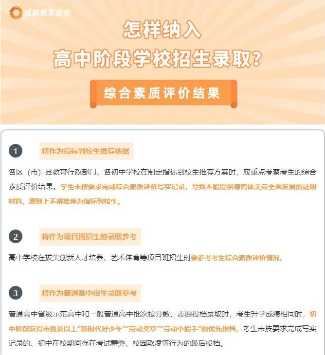 從成都招生考試網(wǎng)了解到,日前,成都教育發(fā)布為大家?guī)砹顺啥际兄袑W(xué)生綜合素質(zhì)評價系統(tǒng)微信端暖心上線的好消息。近日,我們收到了家長的來信綜合素質(zhì)評價結(jié)果會在什么地方派上用場?相信很多初中學(xué)生的家長也對綜合素質(zhì)評價一知半解,不清楚綜合素質(zhì)評價的重要性,今天就一次性為大家講清楚。詳細(xì)內(nèi)容如下: