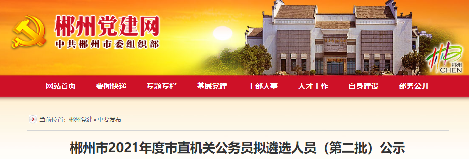 根據(jù)《郴州市2021年度市直機關公開遴選公務員公告》要求,體檢考察合格人員確定為擬遴選人員。現(xiàn)將體檢考察結果和擬遴選人員(第二批)信息進行公示(公示情況表見附件),公示期為7天。公示期內(nèi),如有異議,請以書面形式實名反映并提供相關線索或證據(jù)。
