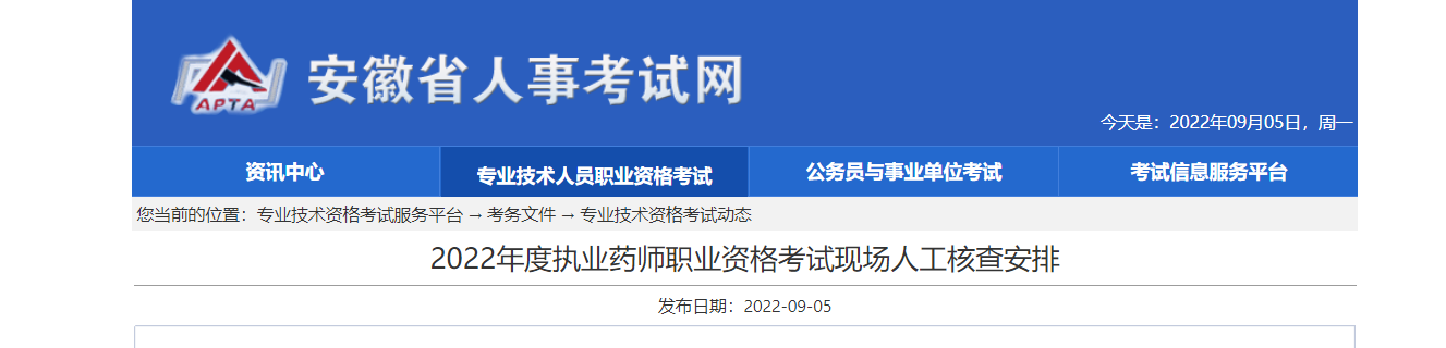 從安徽省人事考試網(wǎng)獲悉,2022年安徽?qǐng)?zhí)業(yè)藥師職業(yè)資格考試現(xiàn)場(chǎng)人工核查安排已公布,請(qǐng)相關(guān)人員仔細(xì)閱讀,具體詳情如下: