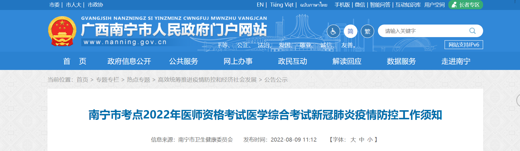 從南寧市人民政府獲悉,2022年廣西南寧醫(yī)師資格考試醫(yī)學(xué)綜合考試新冠肺炎疫情防控工作須知已公布,請相關(guān)人員仔細閱讀,具體詳情如下: