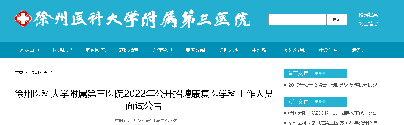 2022江蘇徐州醫(yī)科大學附屬第三醫(yī)院招聘康復醫(yī)學科人員面試公告已出,面試時間:2022年8月23日14:00,現(xiàn)將招聘公告原文發(fā)布如下: