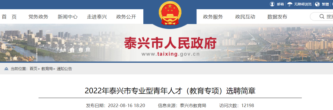 招聘信息指定發(fā)布網(wǎng)站:泰興市人民政府網(wǎng)教育專欄http://www.taixing.gov.cn/col/col56604/index.html