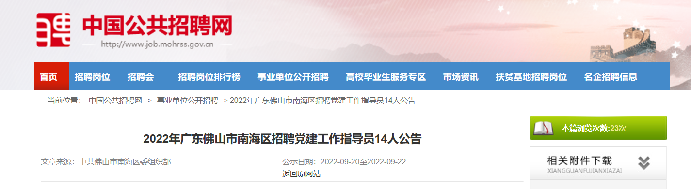本次公開招聘人員共14名,具體崗位詳見《佛山市南海區(qū)2022年公開招聘黨建工作指導(dǎo)員職位表》(附件1),委托中共佛山市南海區(qū)委組織部網(wǎng)站(http://zuzhibu.nanhai.gov.cn/cms/html/nhzg/index.html)發(fā)布招聘信息。