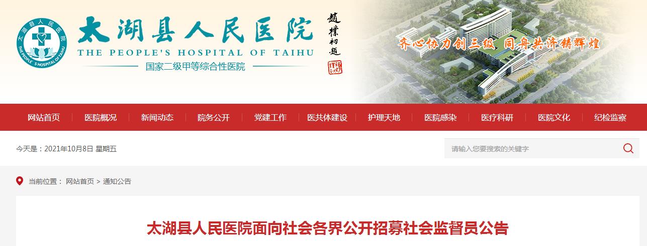2021安徽安慶市太湖縣人民醫(yī)院面向社會(huì)各界招募社會(huì)監(jiān)督員10人,報(bào)名時(shí)間:2021年9月30日至10月10日,現(xiàn)將招聘公告原文發(fā)布如下: