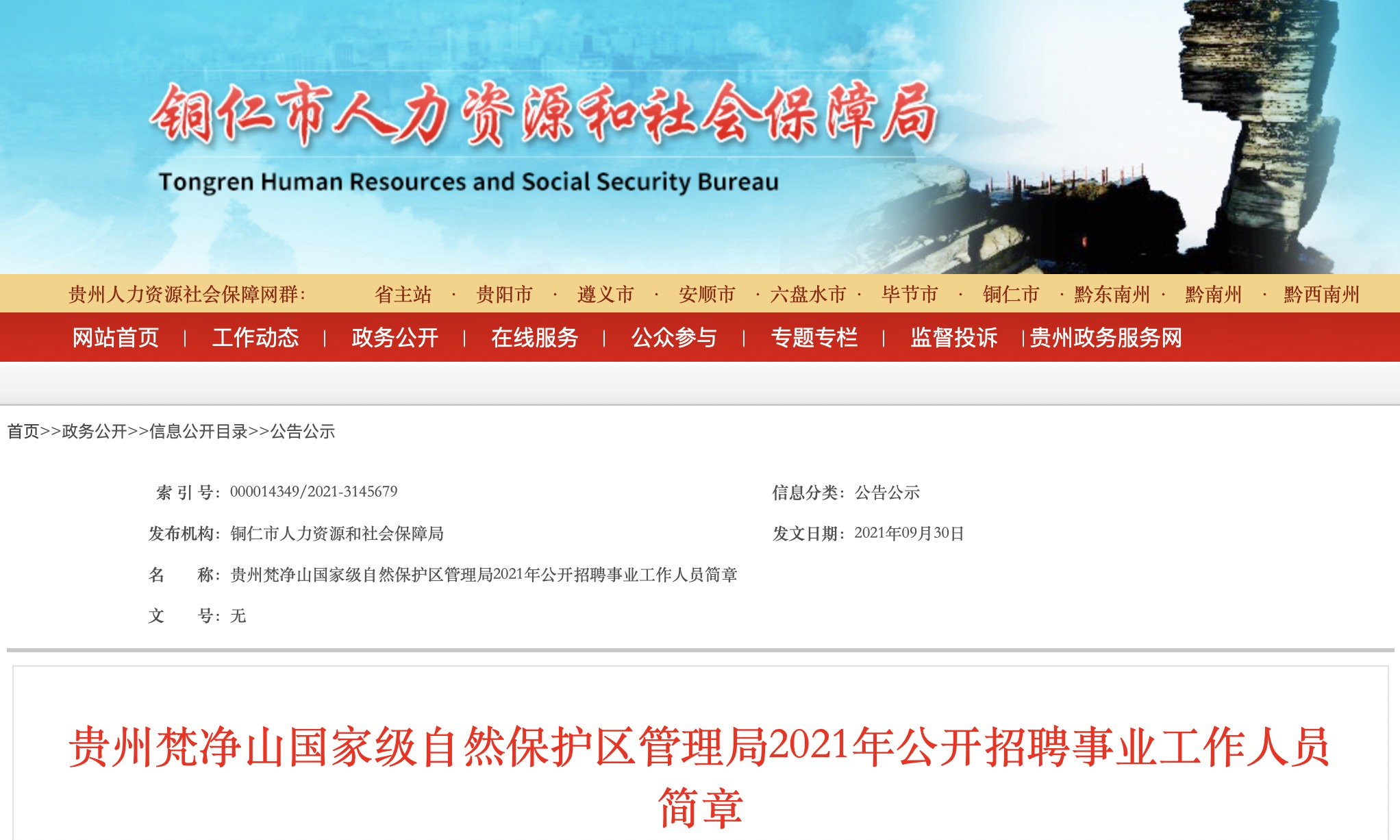 招聘相關(guān)信息在“銅仁人力資源社會(huì)保障網(wǎng)”和“貴州梵凈山自然保護(hù)區(qū)管理局”發(fā)布,網(wǎng)址如下: