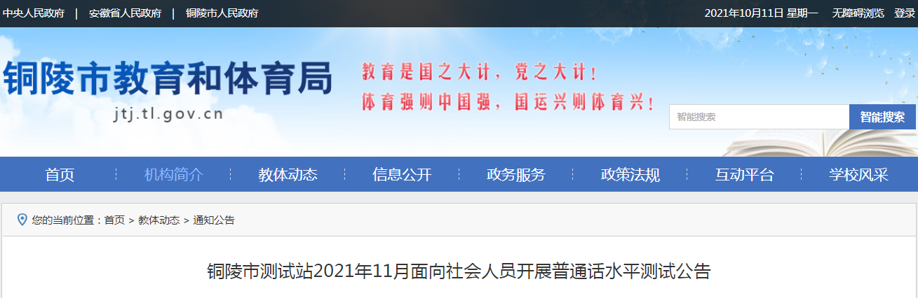 2.報名時間:2021年10月25日10:00起,共500個名額,若名額報滿將提前結(jié)束,請盡早報名。若錯過時間或名額已滿請關(guān)注安徽省普通話培訓測試中心、銅陵市教體局后續(xù)測試公告。