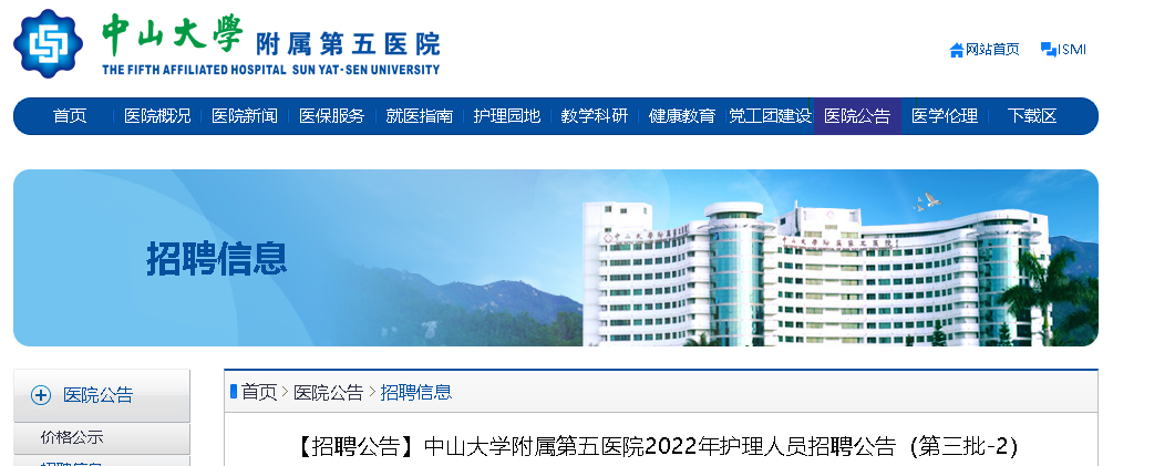 2022廣東珠海中山大學附屬第五醫(yī)院護理人員招聘50人(第三批-2),報名時間:額滿即止,現(xiàn)將招聘公告原文發(fā)布如下: