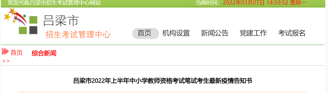 從呂梁市招生考試管理中心獲悉,2022年上半年山西呂梁中小學(xué)教師資格考試筆試考生最新疫情告知書(shū)已公布,請(qǐng)相關(guān)人員仔細(xì)閱讀,具體詳情如下: