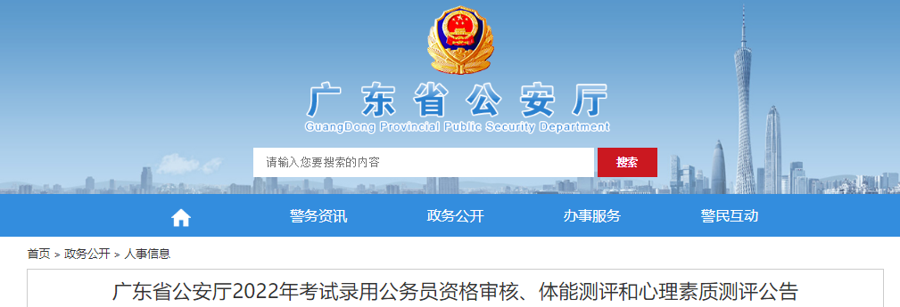 根據(jù)《廣東省2022年考試錄用公務(wù)員公告》《廣東省2022年考試錄用公務(wù)員資格審核等事項公告》,現(xiàn)就廣東省公安廳2022年考試錄用公務(wù)員資格審核、體能測評和心理素質(zhì)測評有關(guān)事項公告如下: