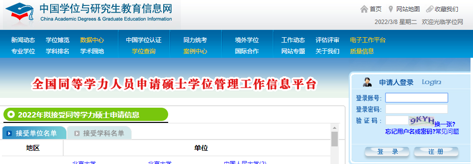從中國學位與研究生教育信息網(wǎng)得知,甘肅2022年同等學力申碩考試報名入口已于2022年3月8日開通,考生可登錄全國同等學力人員申請碩士學位管理工作信息平臺(http://www.chinadegrees.cn/tdxlsqxt)進行報名。具體如下: