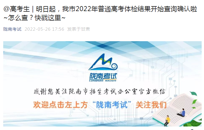 從隴南市招生考試辦公室獲悉,2022年甘肅隴南高考體檢確認(rèn)結(jié)果入口已開通,具體詳情如下: