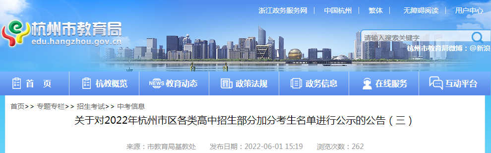 中考頻道從杭州市教育局了解到,2022年浙江杭州市區(qū)各類(lèi)高中招生部分加分考生名單進(jìn)行公示的公告(三)已發(fā)布,詳情如下: