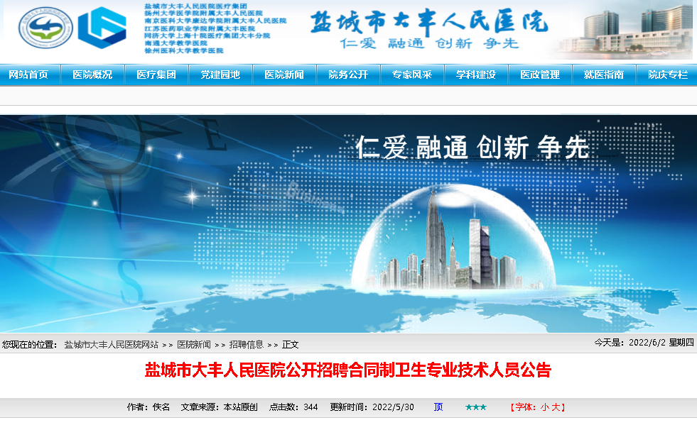 2022江蘇省鹽城市大豐人民醫(yī)院公開招聘合同制衛(wèi)生專業(yè)技術(shù)人員25人,報(bào)名時(shí)間:2022年6月9日—6月11日,現(xiàn)將招聘公告原文發(fā)布如下: