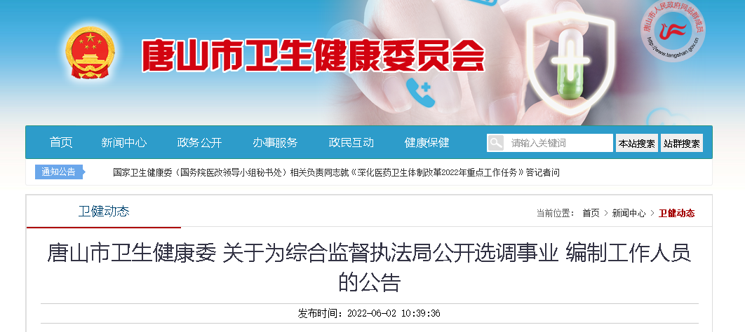 2022河北唐山市衛(wèi)生健康委為綜合監(jiān)督執(zhí)法局選調(diào)事業(yè)編制工作人員2人,報(bào)名時(shí)間:2022年6月8日至6月9日上午9:00-11:30,下午14:30-16:30,現(xiàn)將招聘公告原文發(fā)布如下: