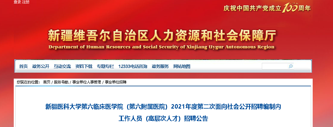 2021年度新疆醫(yī)科大學(xué)第六臨床醫(yī)學(xué)院(第六附屬醫(yī)院)第二次面向社會(huì)公開招聘編制內(nèi)工作人員(高層次人才),報(bào)名時(shí)間:2021年12月27日至2022年1月7日下午19:00,現(xiàn)將招聘公告原文發(fā)布如下: