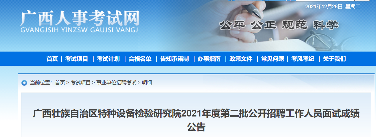 廣西壯族自治區(qū)特種設(shè)備檢驗研究院2021年度第二批公開招聘工作人員面試工作已完成,根據(jù)《廣西壯族自治區(qū)特種設(shè)備檢驗研究院2021年度第二批公開招聘工作人員公告》要求,現(xiàn)公布本次公開招聘考試面試成績(見附件),請各位考生自行查閱。
