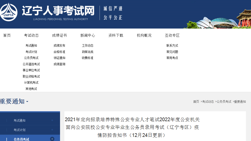 2022年遼寧考區(qū)公安機(jī)關(guān)面向公安院校公安專業(yè)畢業(yè)生考錄公務(wù)員疫情防控告知書已公布,為了方便廣大考生的查閱,下面為您詳細(xì)介紹一下本次公務(wù)員考試疫情防控的具體事宜,希望廣大考生及時(shí)關(guān)注,如有相關(guān)疑問,請(qǐng)關(guān)注公務(wù)員頻道為您實(shí)時(shí)做出的更新。