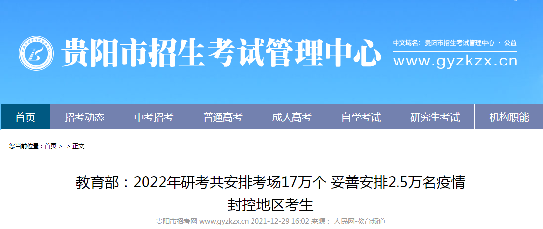 從貴陽市招生考試管理中心了解到,2022年研考共安排考場17萬個,妥善安排2.5萬名疫情封控地區(qū)考生,詳細(xì)內(nèi)容如下: