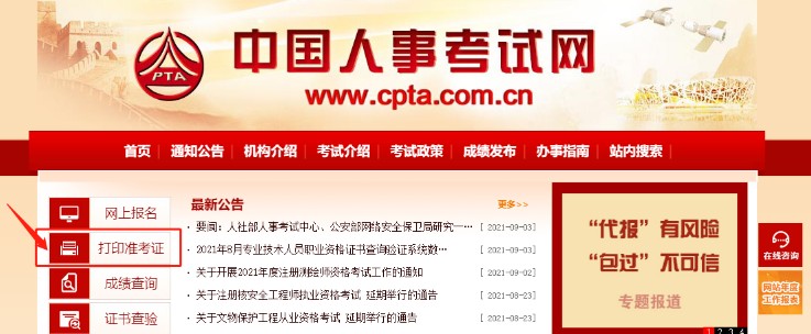 第一步:登錄中國人事考試網(wǎng)(http://www.cpta.com.cn/),點擊左側(cè)“打印準考證”按鈕;