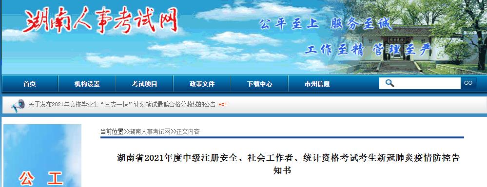 為保障廣大考生和考務(wù)工作人員生命安全和身體健康,確保湖南省2021年度中級注冊安全、社會(huì)工作者、統(tǒng)計(jì)資格考試工作安全進(jìn)行。請所有考生知悉、理解、配合、支持專業(yè)技術(shù)人員職業(yè)資格考試防疫的措施和要求。