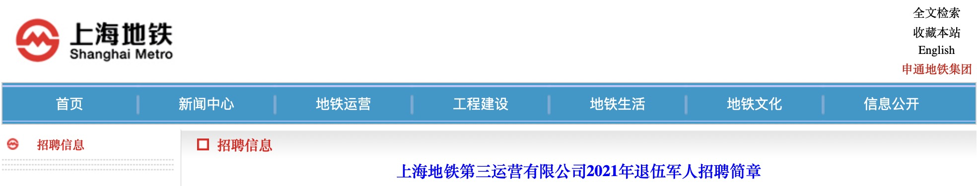 2021年上海地鐵第三運營有限公司退伍軍人招聘公告【55人】已發(fā)布,報名截止時間為:2021年10月18日,現(xiàn)將招聘公告原文發(fā)布如下: