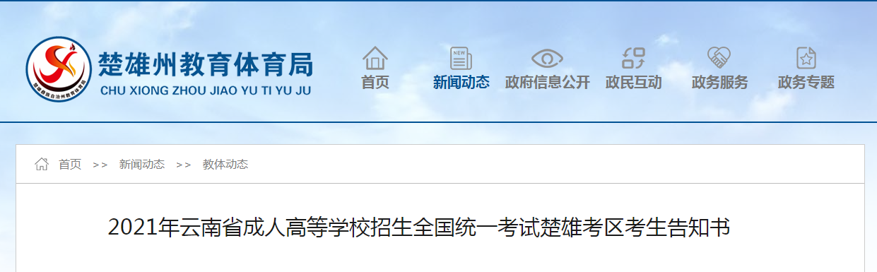 從楚雄州教育體育局了解到,2021年云南省成人高等學(xué)校招生全國(guó)統(tǒng)一考試楚雄考區(qū)考生告知書,現(xiàn)將有關(guān)事宜通知如下: