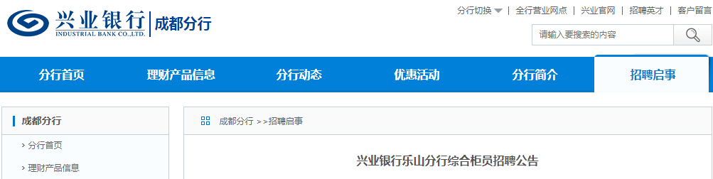 2021興業(yè)銀行四川樂山分行綜合柜員招聘公告已發(fā)布,報名申請入口已開通,現(xiàn)將招聘公告原文發(fā)布如下: