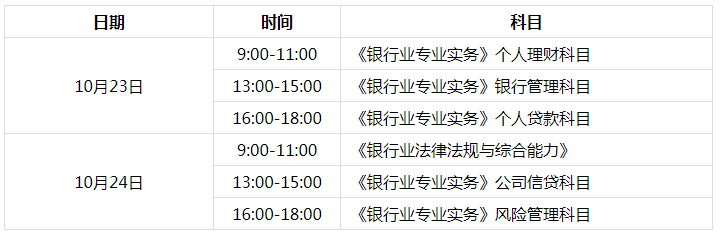 2021年下半年中級(jí)銀行從業(yè)資格考試時(shí)間:2021年10月23日-24日