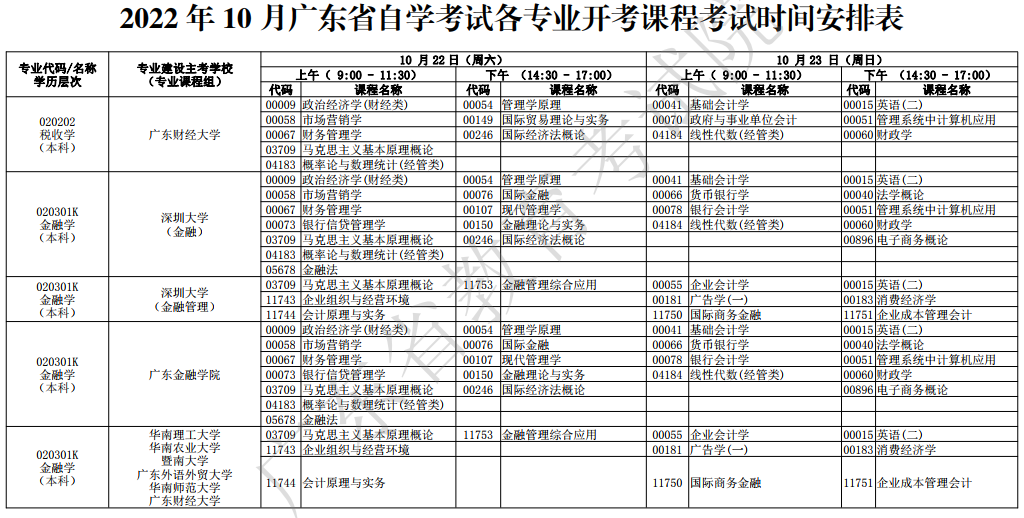 點擊查看完整版>>>2022年10月廣東省自學考試各專業(yè)開考課程考試時間安排表