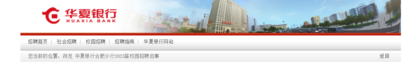 2023屆安徽省華夏銀行合肥分行校園招聘啟事已發(fā)布,因業(yè)務(wù)發(fā)展需要,現(xiàn)誠邀優(yōu)秀青年學(xué)子加盟,期待與您同發(fā)展,共成長。現(xiàn)將招聘信息發(fā)布如下: