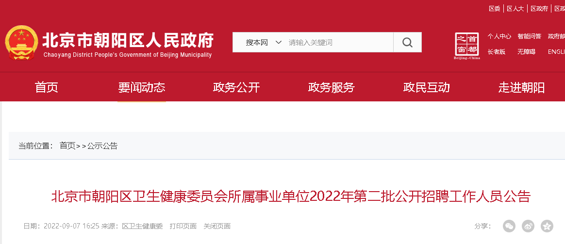 2022北京朝陽(yáng)區(qū)衛(wèi)生健康委員會(huì)所屬事業(yè)單位第二批招聘338人,報(bào)名時(shí)間:2022年9月7日9:00至2022年9月16日16:00,現(xiàn)將招聘公告原文發(fā)布如下: