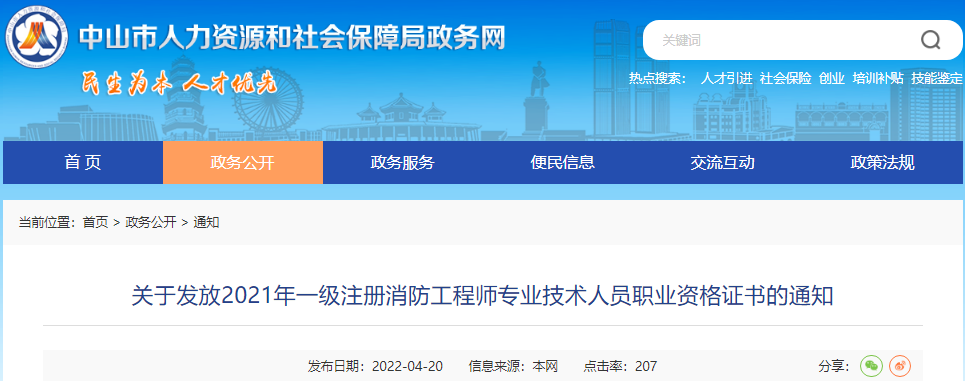 關(guān)于發(fā)放2021年一級注冊消防工程師專業(yè)技術(shù)人員職業(yè)資格證書的通知