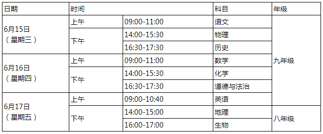 (一)語文、數(shù)學、英語、物理、道德與法治、化學、歷史、地理、生物考試時間為2022年6月15日至17日,具體安排如下: