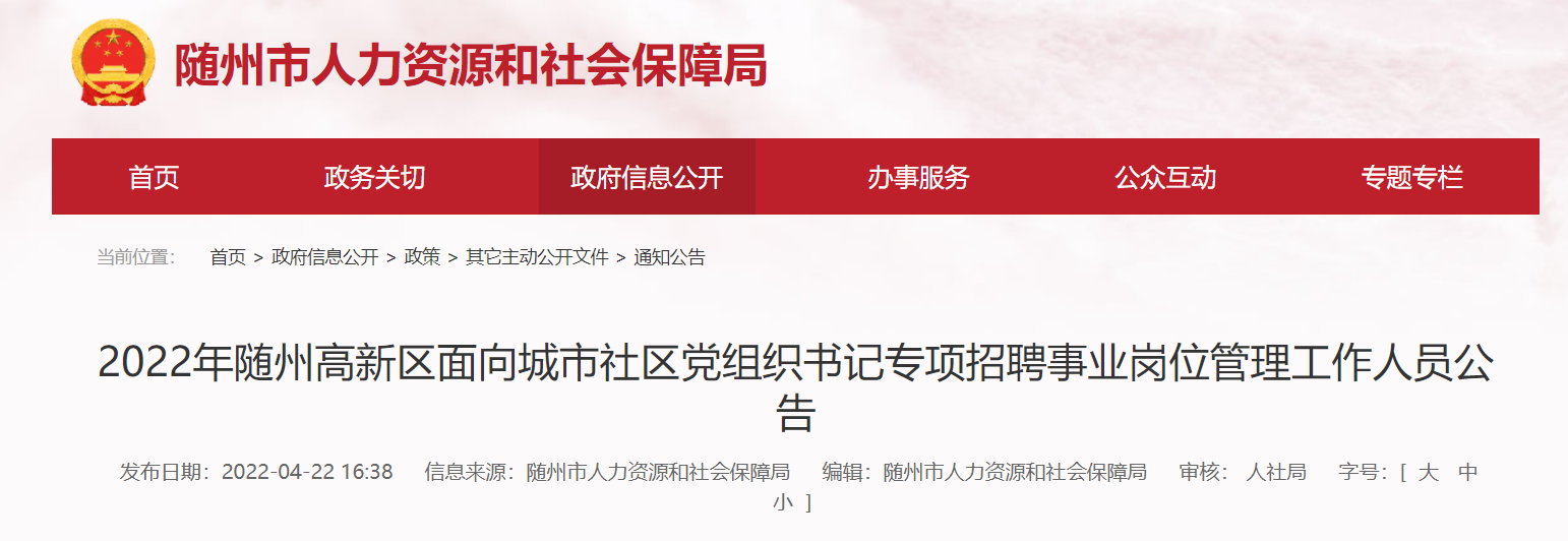 根據(jù)中共隨州市委組織部、隨州市人社局《關(guān)于印發(fā)<隨州市城市社區(qū)黨組織書記實(shí)行事業(yè)崗位管理專項(xiàng)招聘工作方案>的通知》(隨人社發(fā)〔2020〕16號(hào))和《2022年隨州高新區(qū)城市社區(qū)黨組織書記實(shí)行事業(yè)崗位管理專項(xiàng)招聘工作方案》文件精神,結(jié)合隨州高新區(qū)實(shí)際,現(xiàn)面向我區(qū)城市社區(qū)黨組織書記專項(xiàng)招聘事業(yè)崗位工作人員,為您整理了招聘條件和報(bào)名流程,供您參考。