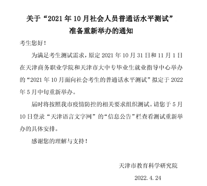 從天津語言文字網(wǎng)獲悉,2021年10月天津社會人員普通話水平測試準(zhǔn)備重新舉辦的通知已公布,請相關(guān)人員仔細(xì)閱讀,具體詳情如下: