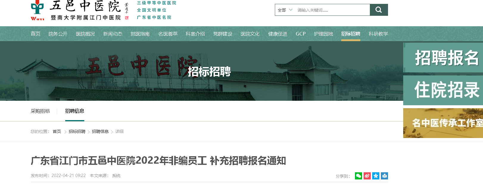 2022廣東江門(mén)市五邑中醫(yī)院非編員工補(bǔ)充招聘40人,報(bào)名時(shí)間:2022年4月20日至5月4日,現(xiàn)將招聘通知原文發(fā)布如下: