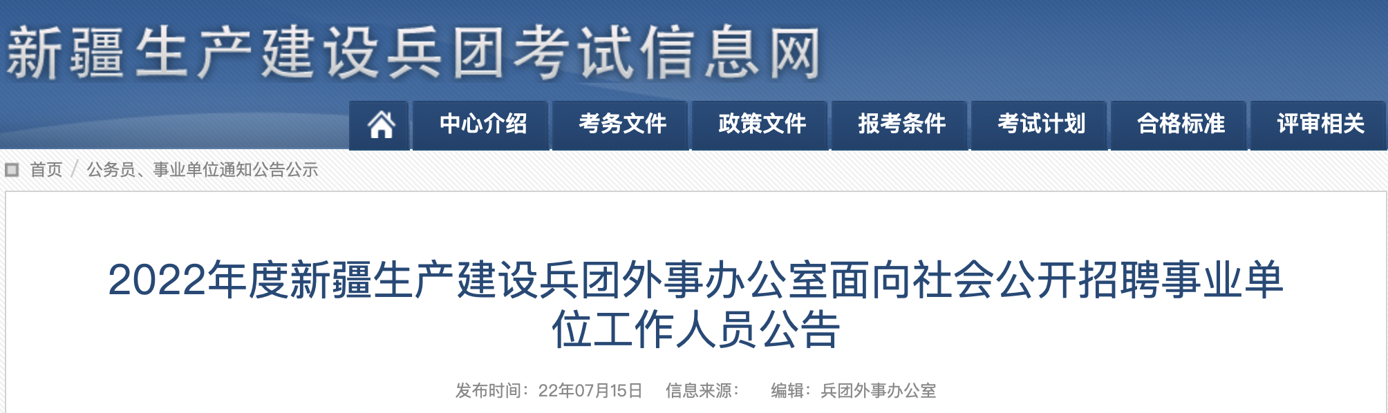 2022年新疆生產(chǎn)建設(shè)兵團(tuán)外事辦公室事業(yè)單位工作人員招聘公告已發(fā)布,網(wǎng)絡(luò)報名截止時間為:2022年7月24日19:00,現(xiàn)將招聘公告原文發(fā)布如下: