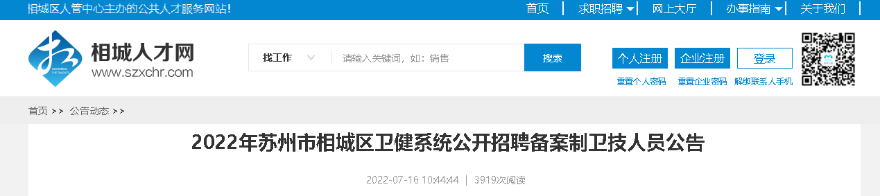 2022年江蘇省蘇州市相城區(qū)衛(wèi)健系統(tǒng)公開招聘備案制衛(wèi)技人員256人,報(bào)名時(shí)間:2022年7月25日9:00—7月27日16:00,現(xiàn)將招聘公告原文發(fā)布如下: