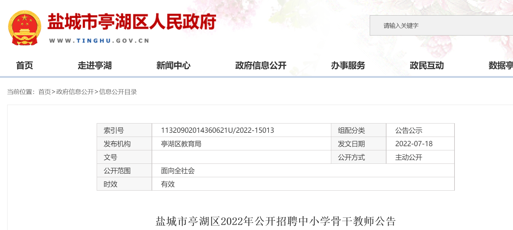 2022年江蘇鹽城亭湖區(qū)公開招聘中小學(xué)骨干教師62人,報(bào)名時(shí)間:2022年7月24日9:00—7月27日16:00?,F(xiàn)將招聘公告原文發(fā)布如下: